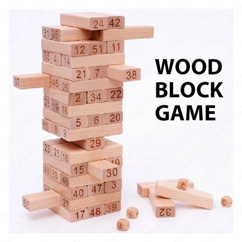 Enjoy endless fun with this Wooden Tumbling Tower Game featuring 51 precision-cut blocks and 4 dice. Perfect for game nights, family fun, and skill development. Suitable for kids and adults alike!